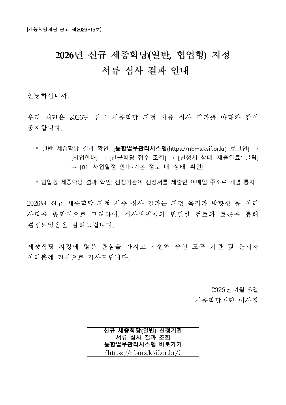 2026년 신규 세종학당(일반, 협업형) 지정 서류 심사 결과 안내