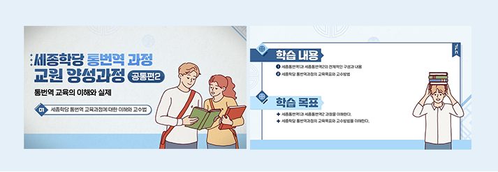 또한 재단은 〈세종통번역〉 교재를 활용해 강의하는 교원들의 교수 역량을 높이기 위해 ‘통번역 교원 양성용 동영상 강의’도 함께 개발해 ‘누리 세종학당’에 공개했습니다. 총 28차시로 구성된 이 동영상 강의는 통역과 번역 전반에 대한 이해를 높이고, 교재를 활용한 수업 운영 방안에 대한 내용을 담고 있으며 ‘공통 편’과 ‘개별 편’으로 구분돼 있습니다. 공통 편은 총 16차시로 구성돼 통·번역에 대한 이해 및 교재를 활용한 교수법을, 개별 편은 총 12차시로 이뤄져 12개 언어별 모의수업을 통한 교수법을 제공합니다. 아울러 개별 편의 부가 교육 자료로 12개 언어별 모의수업 운영 지침이 요약돼 있는 핸드북* 파일도 제공됩니다. * 누리세종학당 내 [교육]-[한국어 교원 연수]-[세종학당 통번역 교원 양성 과정]-[강의실] 내 공지 사항에서 내려받기 가능