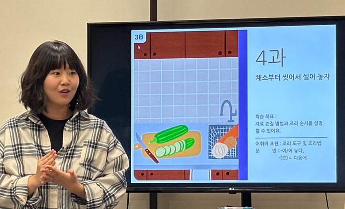 한국어 수업 모의 실습은 초급 2A반과 중급 3B반에서 총 6시간 진행하며 교안 작성과 피드백 과정을 통해 수업을 바라보는 시야를 넓힐 수 있었습니다. 어휘와 표현을 제시할 때 명시적으로 제시할 수 있는 어휘와 별도 설명이 필요한 어휘를 구분해야 한다는 점 등 생각하지 못한 부분들을 지도 선생님이 세심하게 짚어주셔서 한국어 교육 시 고려해야 할 부분들을 넓게 이해할 수 있었어요. 또한 초급과 중급반의 수업 진행 방식이 달라야 한다는 점도 배울 수 있었습니다. 초급반 수업에서는 ‘단계별 수업’이 효과적이지만, 중급반 수업에서는 ‘-아/어요’로 쉽게 설명하는 것이 아니라 이전에 배운 문법을 적절히 활용해 설명해야 한다는 피드백을 받았는데요. 이를 통해 교재 한 과의 내용만 전달하는 것이 아니라 학습자의 수준에 맞춰 설명을 달리해야 한다는 것을 알 수 있었습니다. 이후 「세종한국어」 교재의 교수요목을 다시 공부하면서 수업 구성을 더 체계적으로 이해할 수 있었고, 교수 역량을 보완할 수 있었습니다.