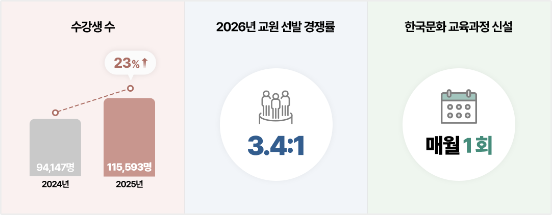 2025년 온라인 세종학당은 전 세계적인 한국어 열풍을 입증하며 전년 대비 23% 증가한 115,593명의 수강생이 학습했습니다. 2026년 교원 선발에는 약 3.4대 1의 경쟁률을 기록해 온라인 세종학당에 대한 높은 관심을 보였습니다. 올해는 한국어 교육과정뿐 아니라 매월 1회 운영되는 ‘한국문화 과정’을 신설해 학습자들이 한국문화에 대한 이해를 넓힐 수 있는 기회를 제공할 예정입니다.