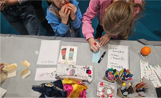 Local children making Hangeul bookmarks
