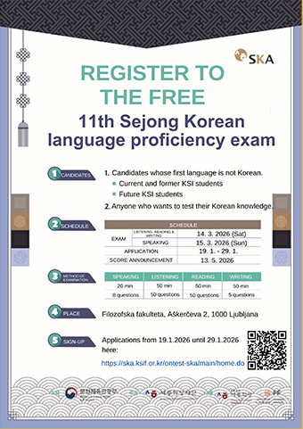 KSI Saint Petersburg in Russia and KSI Ljubljana in Slovenia have been selected as official European test sites for the 11th Sejong Korean language Assessment (SKA) to be held on March 14. KSI Ljubljana is actively promoting the Sejong Korean language Assessment (SKA) to its learners as well as to students in the Department of Korean Studies at the Faculty of Arts, University of Ljubljana.