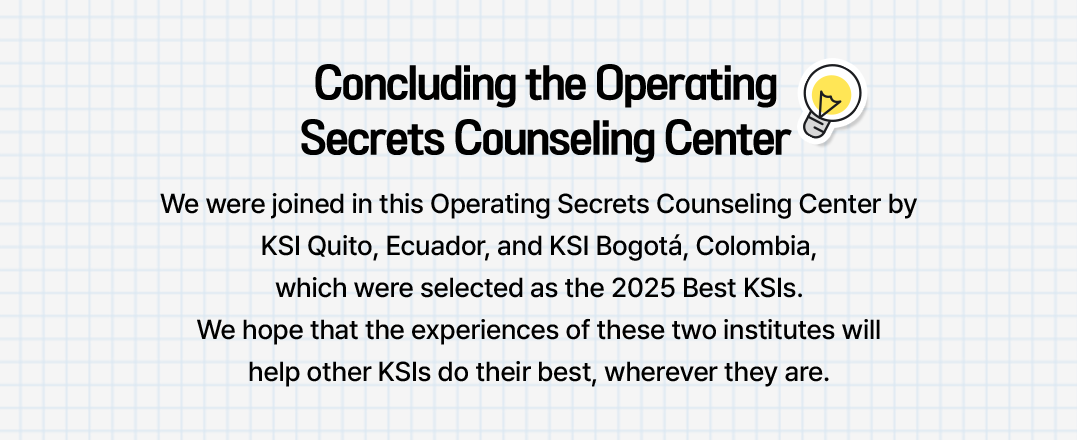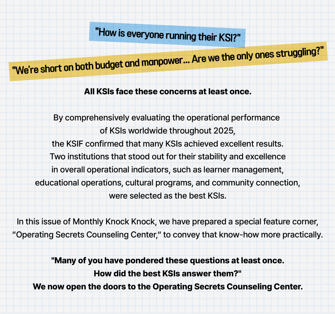 A. (KSI Bogotá) “Rather than looking at the big picture from the outset, first establish a firm and basic operating structure. In the beginning, you may lack manpower or budget, but the process of establishing a framework by faithfully following basic procedures such as attendance management, satisfaction checks, communication with teachers, and KSIF reporting and settlement is more important than anything else.