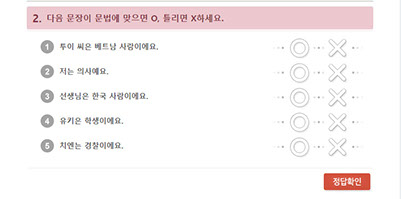 콘텐츠입니다. ‘한국어 기초 문법’으로 공부하면 문법을 활용하여 어떻게 문장을 만들 수 있는지 배울 수 있습니다. 또 다양한 연습문제들을 풀며 자연스럽게 문법 표현들을 익힐 수 있습니다.