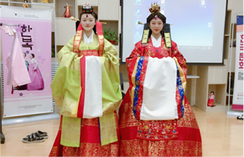▲ A student participating in the special lecture on Hanbok on last July 2nd is taking a photo in the traditional wedding costume of Korea.